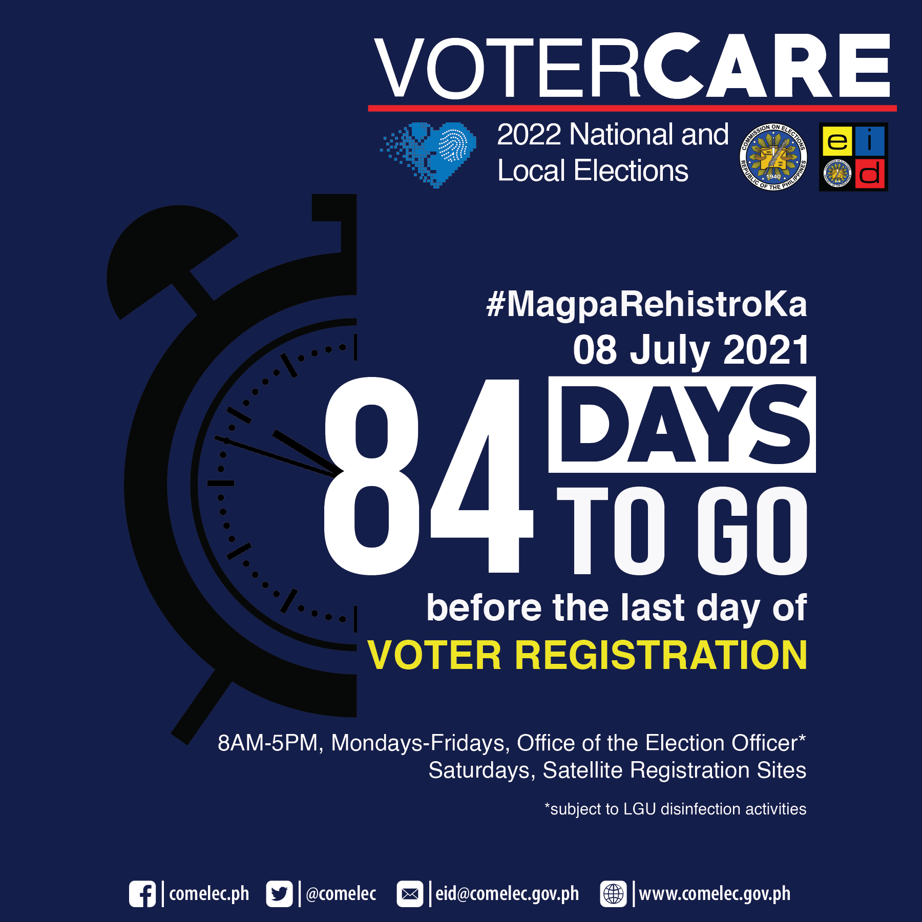 Comelec On Twitter Today Is 8 July 2021 And It Is 84 Days Before The Last Day Of Voter Registration Magparehistroka Na Votercare Nle2022 Voterreg2021countdown Https T Co Sdxooctvj9